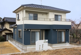 1階は濃い色調、2階には明るい色調のものを使って上下貼り分けることによってシンプルでモダンなイメージになった外観。 陶器瓦を使った寄棟屋根です。